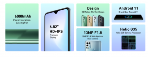 - Écran 6.82″ LCD IPS (720 x 1640 Pixels) – Processeur: MediaTek MT6765G Helio G35 (12 nm) Octa-Core (4×2,3 GHz Cortex-A53 et 4×1,8 GHz Cortex-A53) – Systéme d’exploitation: Android 11 – Mémoire RAM: 4Go – Stockage: 64 Go – Appareil Photo Arriére: 13.0 MP + AI et Appareil Photo Frontale: 8.0 MP – Connctivité: 4G Wifi et Bluetooth – Batterie: Li-Po 6000 mAh – Capteur d’empreintes digitales – Double SIM – Couleur: Gold – Garantie: 1 an